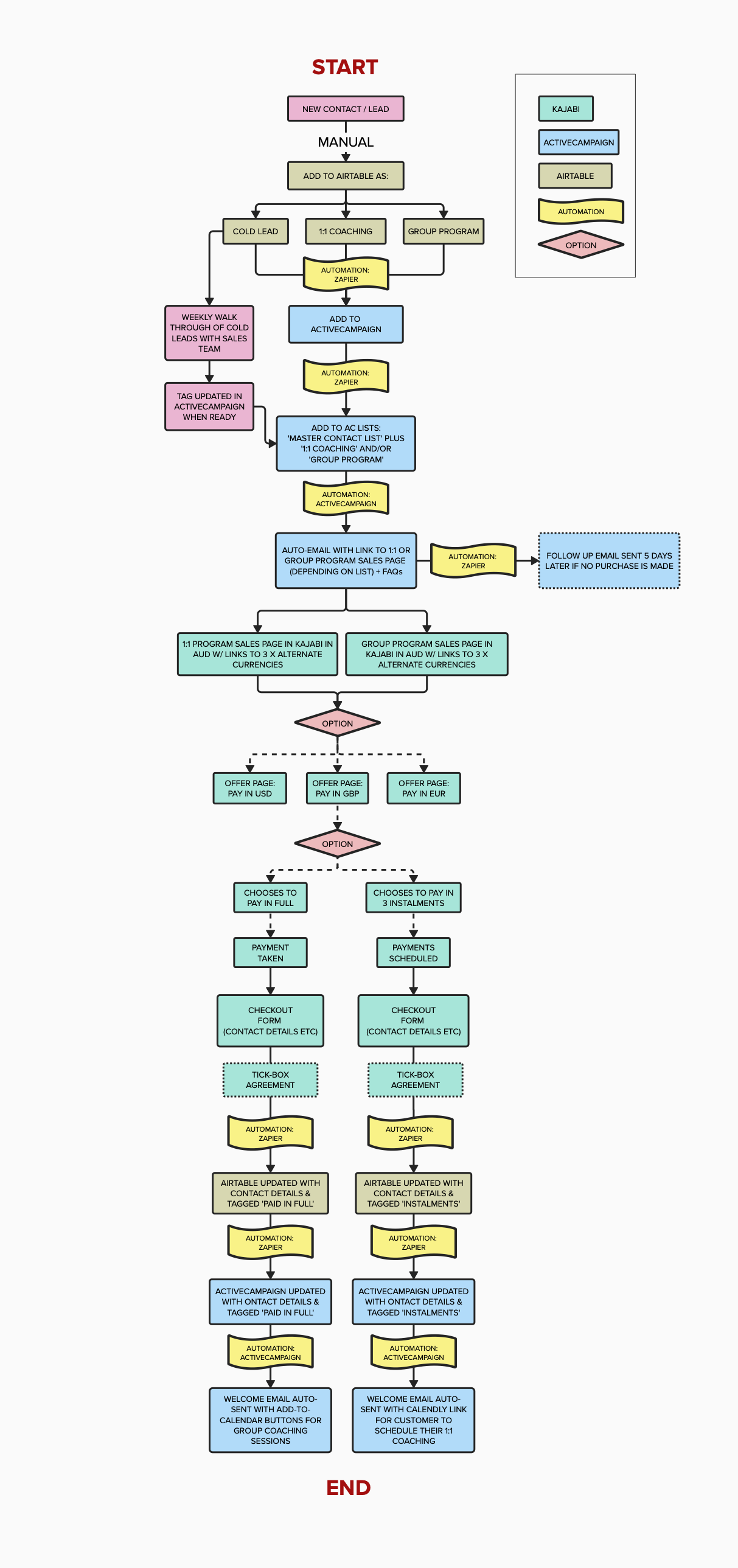 This is an example of a workflow for a global leadership coaching firm that utilises digital automations as much as possible, starting from the point when a new contact or lead is established, leading them through the payment and sign up process, and ending with a program Welcome Email being sent.